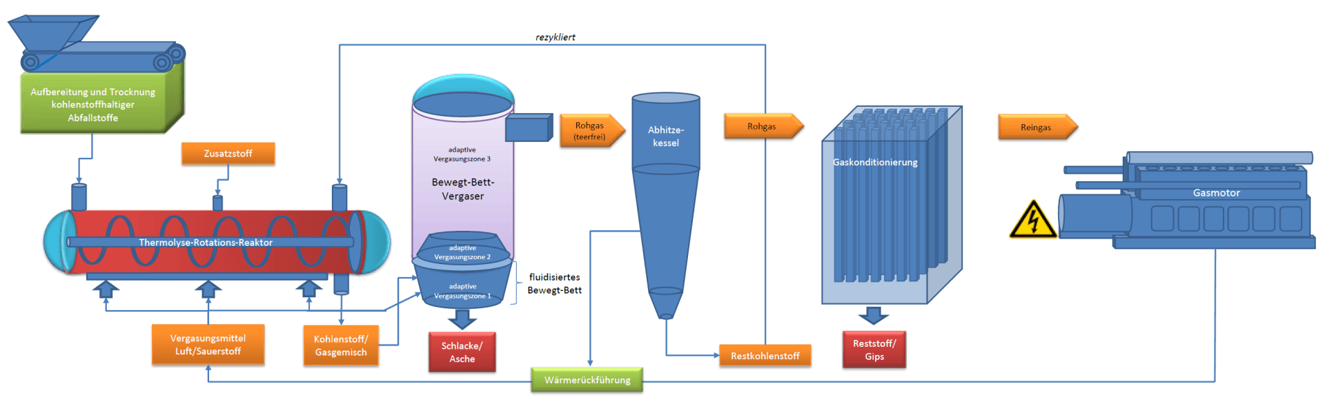The systems for generating energy from garbage and waste work according to the INTEC synthesis gas process. This process is patented.